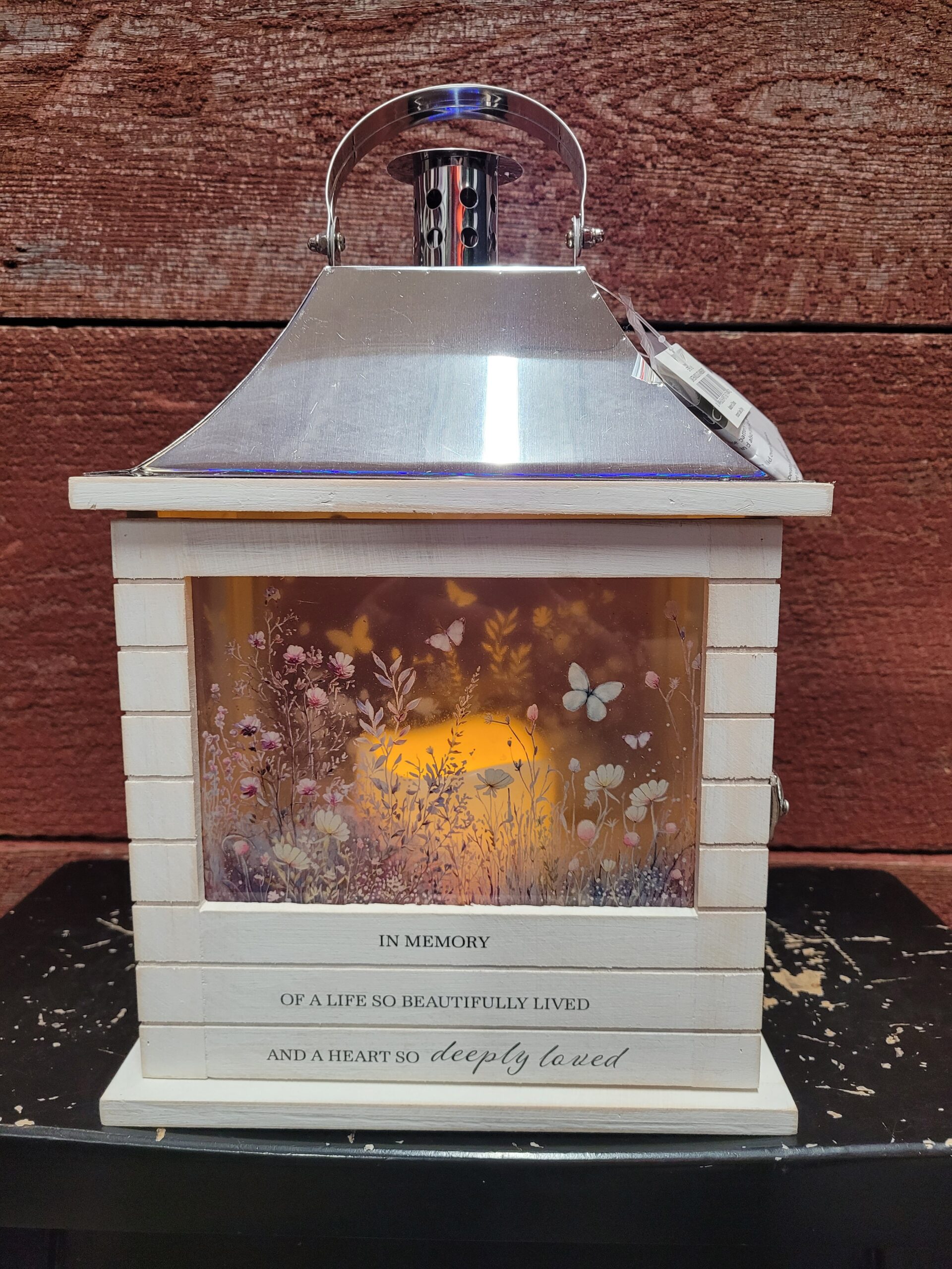 Lantern light up ising 3aaa batteries (provided with product) and says, “In memory of a life so beautifully lived, and a heart so deeply loved”